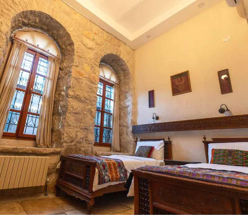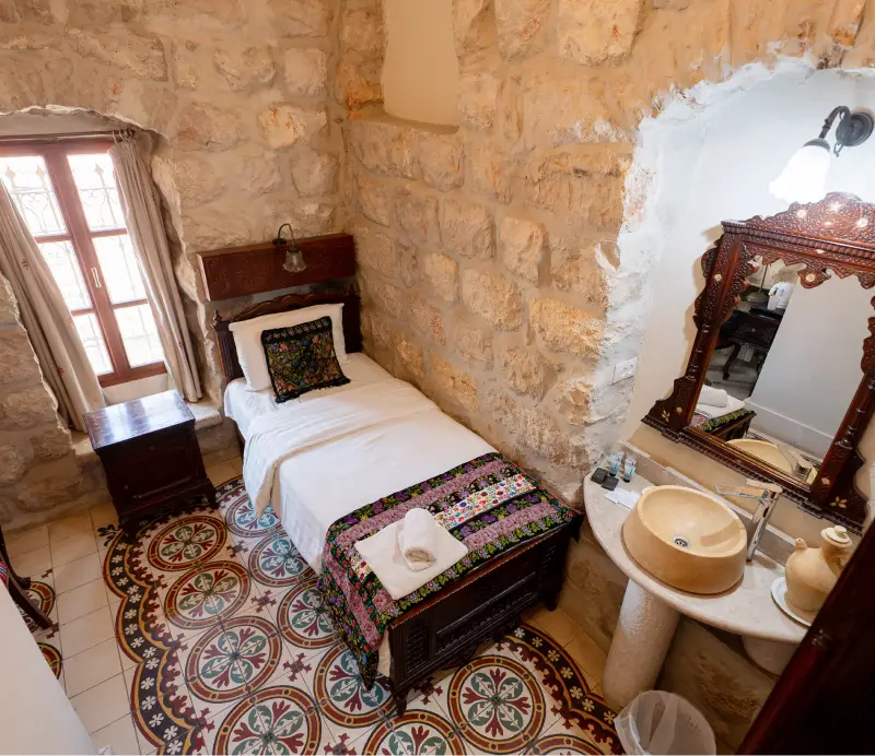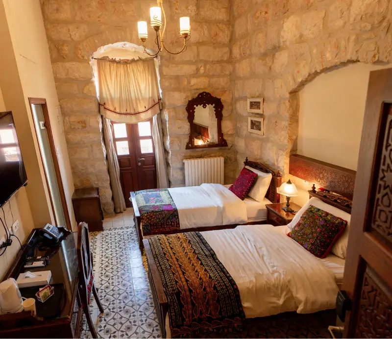 Welcome to The Jerusalem Hotel, a historic gem nestled in Jerusalem’s ancient city, proudly managed by the Saadeh family since 1960. Our hotel boasts authentic 20th-century Arab architecture featuring arched windows, high ceilings, and a tranquil restaurant. Painstakingly restored since 1991, we seamlessly blend traditional Arabesque décor with exquisite antiques, offering a unique ambiance that mirrors Jerusalem’s storied past.